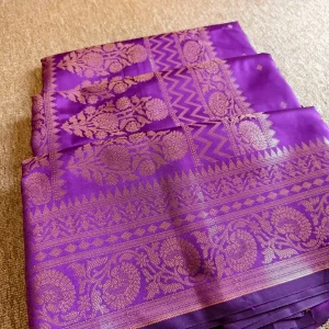 Elegant violet Banarasi soft silk saree with golden buttas, rich floral and zig-zag pallav and brocade blouse, perfect budget friendly festive wear.
