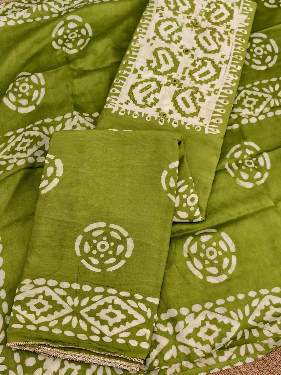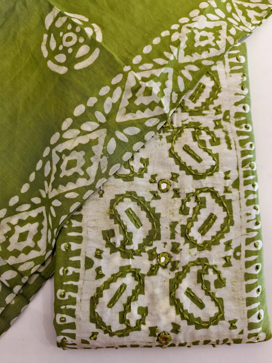 A Cotton salwar suit featuring an intricately hand embroirdered yoke with mirror works that adds a touch of sparkle to everyday elegance. Paired with a printed cotton salwar for comfort and a Dupatta with applique work. It offers a look that’s simple yet sophisticated.