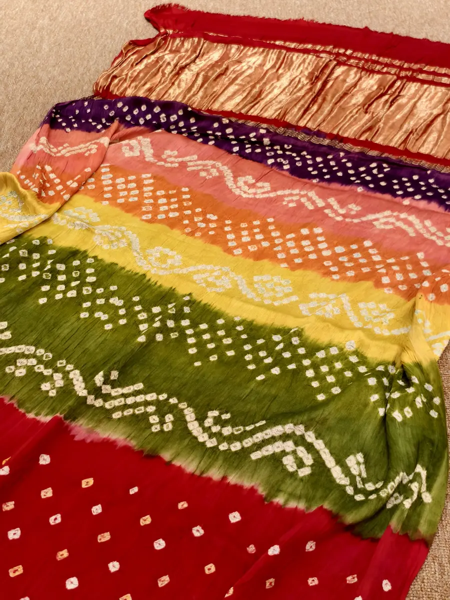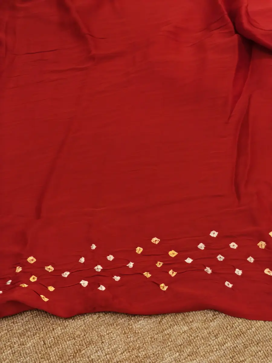 Add a touch of tradition to your wardrobe with this vibrant Red modal silk saree, featuring classic Bandini. The contrasting multi coloured and tissue pallav enhance its festive charm. Lightweight, elegant, and perfect for special occasions.