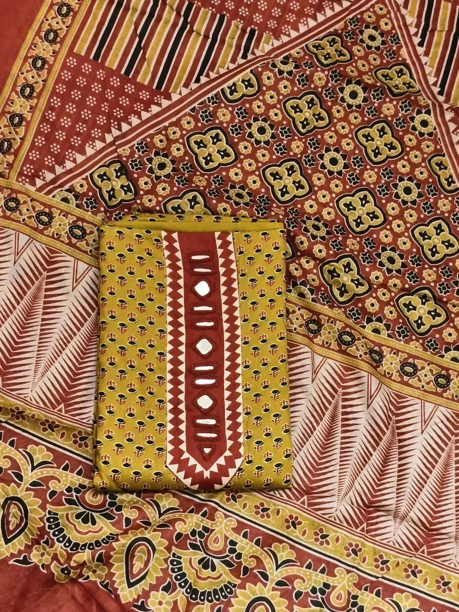 – Printed Rayon kurta fabric with embroidered mirror worked patch on yoke.