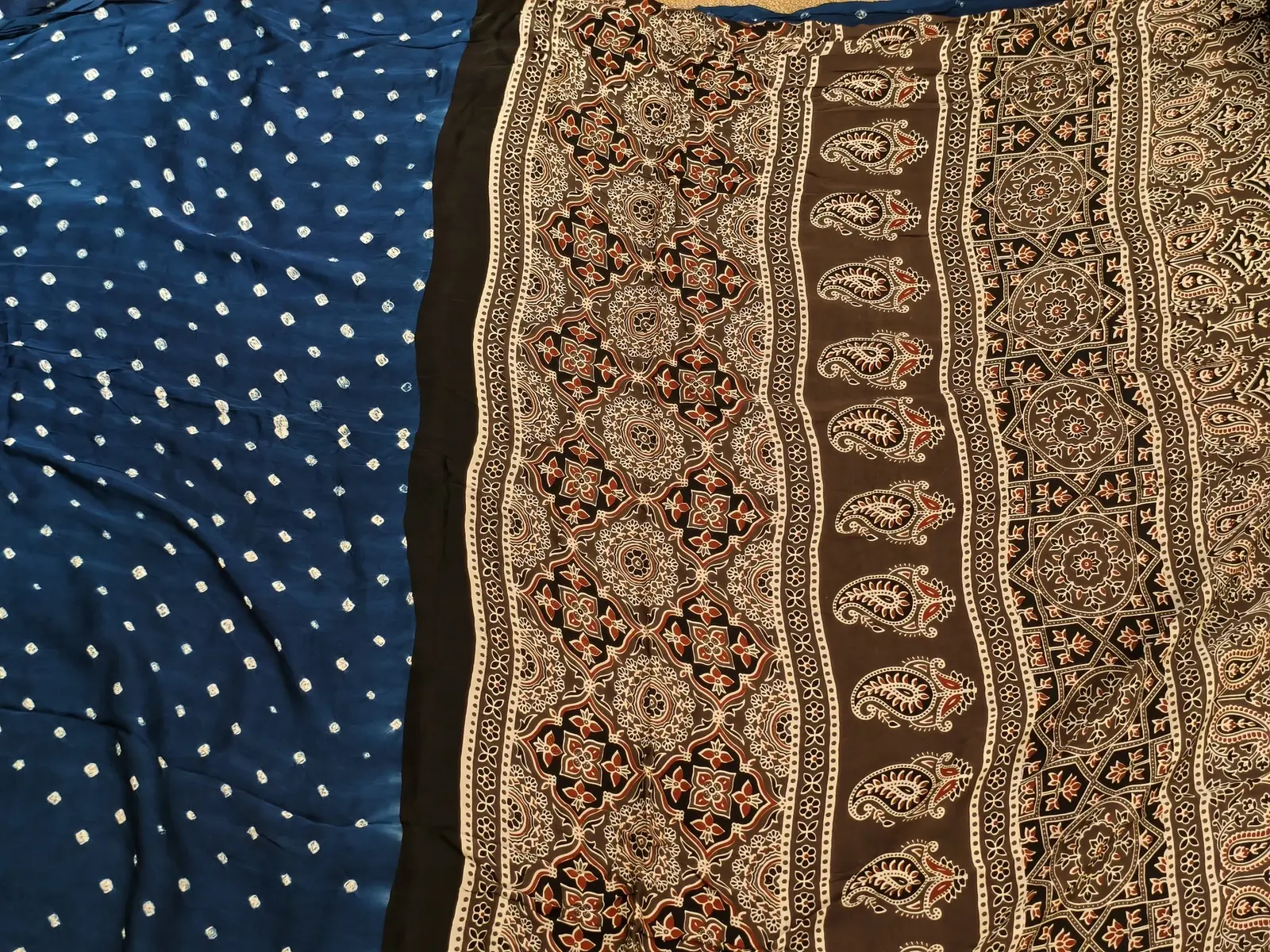 ₹5,500.00Add to cartA graceful Modal silk saree features Ajrakh pallavu and Bandhni printed body. Material Used Modal Silk Print / Work Ajrakh and Bandhni Length 5.5 MTR saree length Blouse Modal silk …