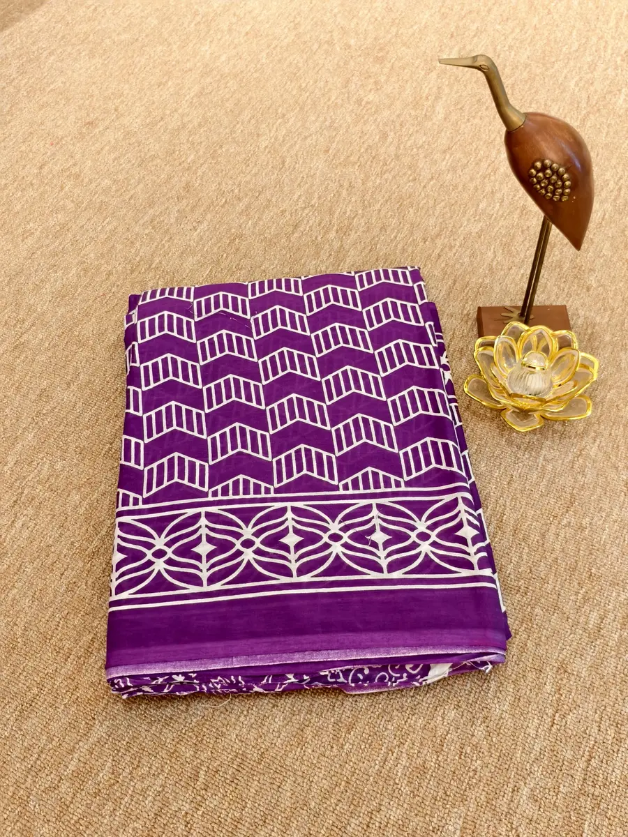 ₹1,250.00Add to cartCotton saree in violet with exquisite and vibrant print all over comes with an attached blouse piece. Material Used Cotton Print / Work Hand Block Print Length 5.5 MTR saree…